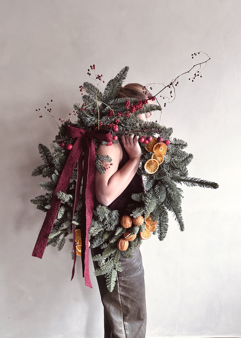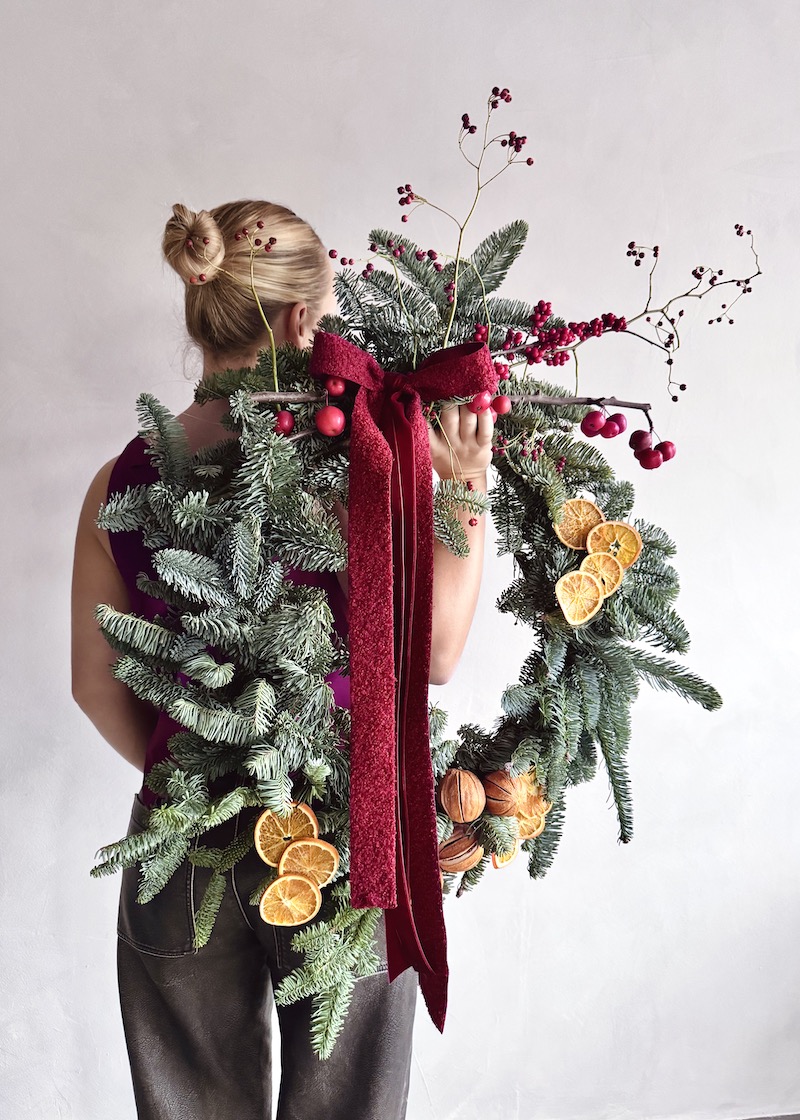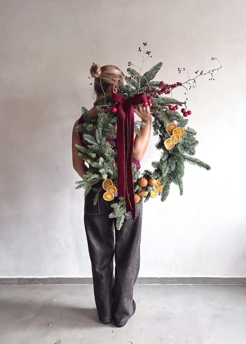 Ovaj ručno pleteni božićni vjenčić od vrhunskih grana silber jela s dodacimaunosi prirodnu eleganciju i ležeran stil u svaki prostor. Ukrašen granom šipka, intezivno crvenog Ilexa, grane neodoljivog malusa, sušenim narančama i svježim narom, vjenčić stvara savršen balans između prirodnih elemenata i blagdanskog šarma, dodajući sofisticirani šarm vašem interijeru.