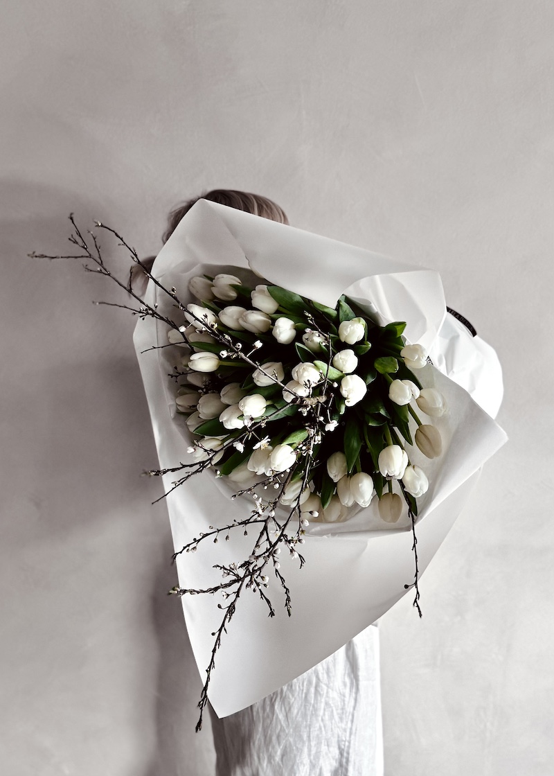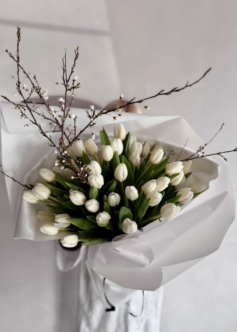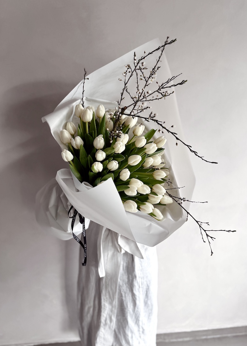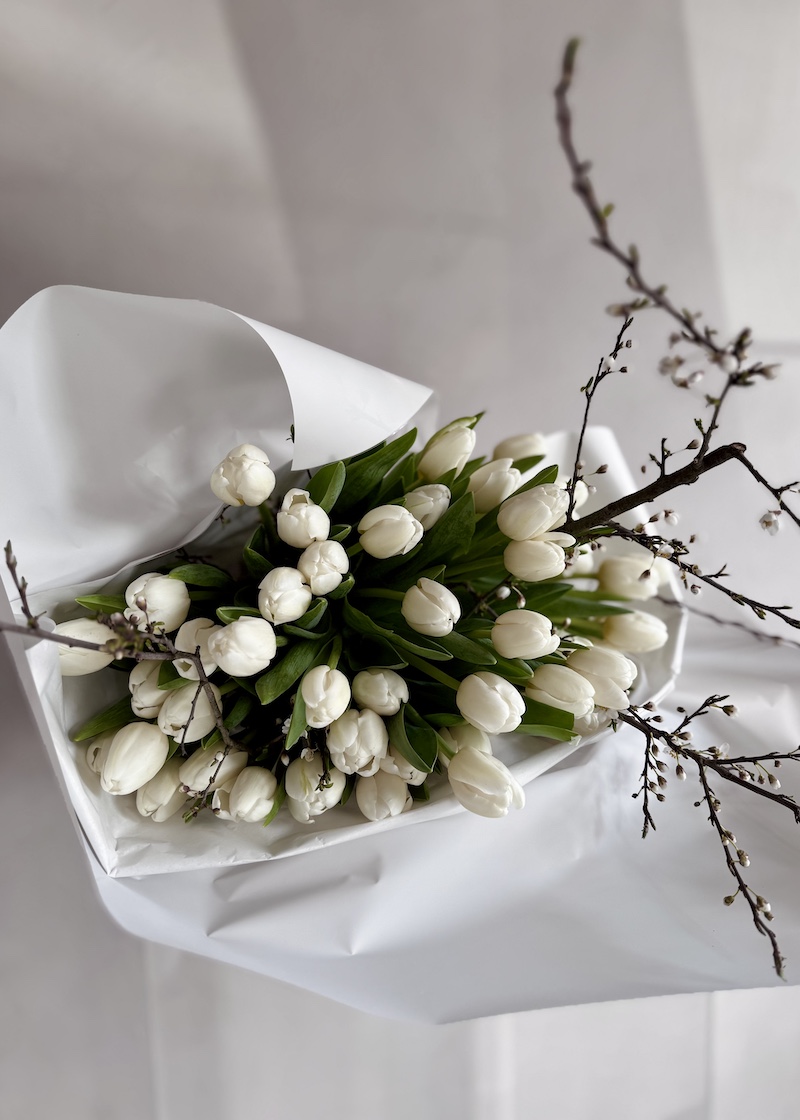 Ovaj profinjeni buket bijelih tulipana odiše elegancijom, nježnošću i bezvremenskom romantikom. Simbol čistoće, iskrenih emocija i novih početaka, bijeli tulipani pažljivo su aranžirani kako bi zadržali svoju prirodnu ljepotu i svježinu. Ušuškani u elegantne bijele papire, stvaraju skladan i sofisticiran dojam koji se savršeno uklapa u svaku priliku.