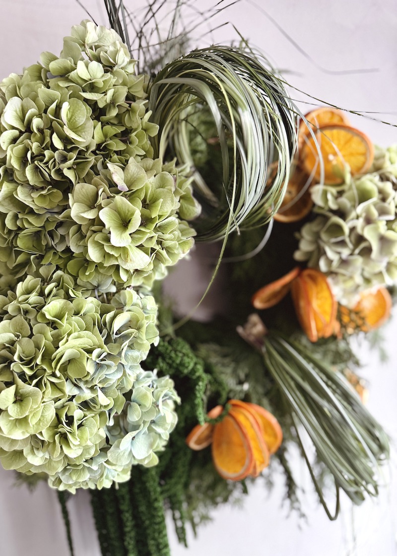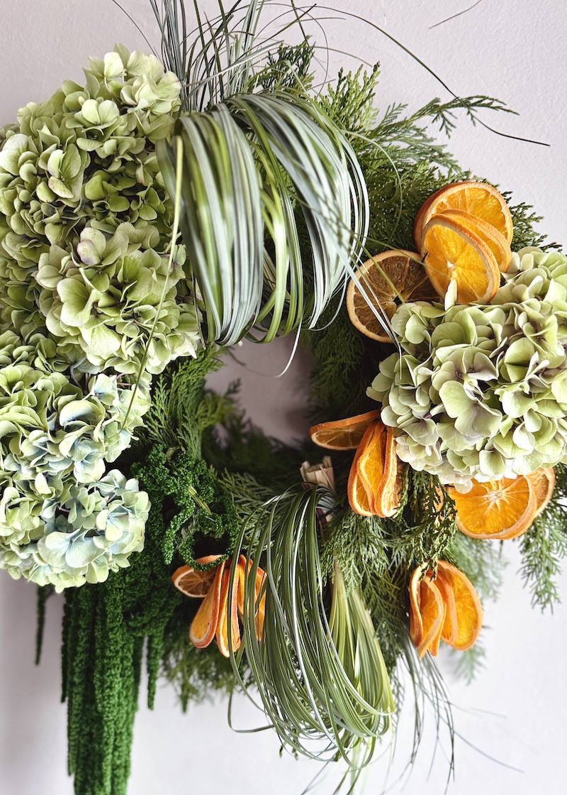 Vjenčić krase zeleni cvjetovi hortenzije, bergas trava, dekorativni zeleni amarantus te sušene naranče, koje unose toplu, aromatičnu notu klasičnog blagdanskog ugođaja. Sklad prirodnih elemenata stvara moderan, svjež i vizualno bogat sezonski akcent.