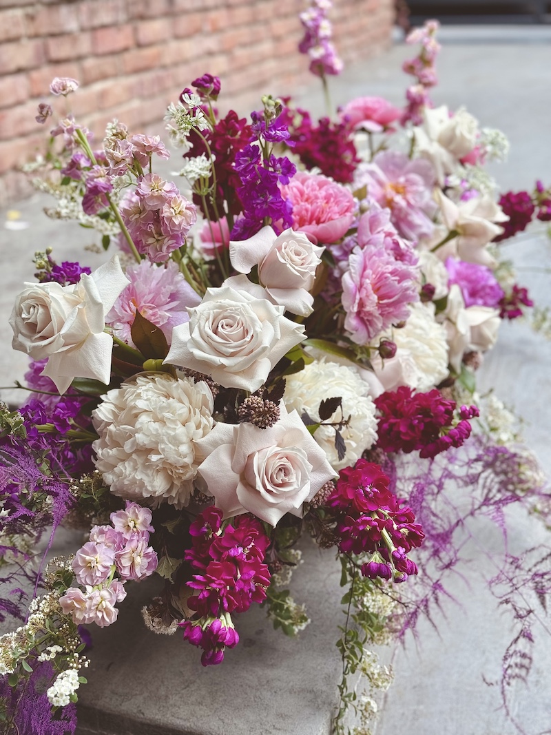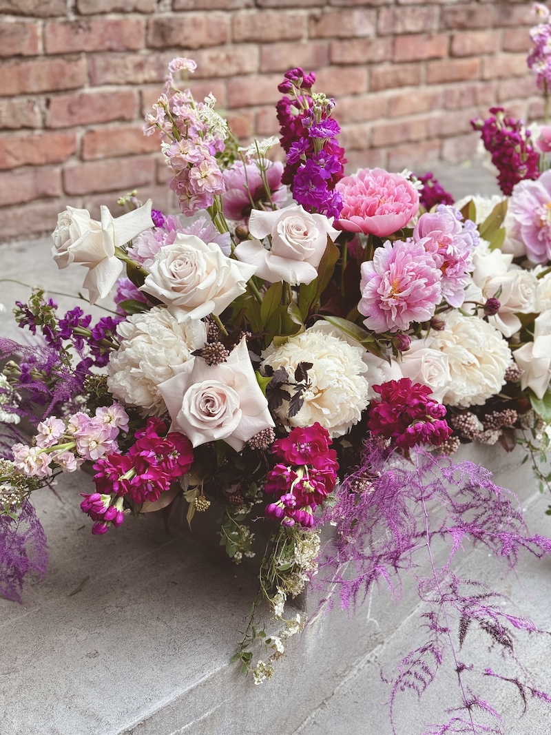 Ovaj sezonski šareni cvjetni aranžman izrađen je s naglaskom na ravnotežu boja, oblik i svježinu. U kompoziciji se spajaju nježne i intenzivnije nijanse ružičaste, bijele i tamnoružičaste, stvarajući uravnotežen i vizualno privlačan izgled. Dominantne cvjetne vrste, poput ruža i božura, upotpunjene su sezonskim cvijećem i decentnim zelenilom koje dodatno naglašava prirodnost cijele dekoracije.